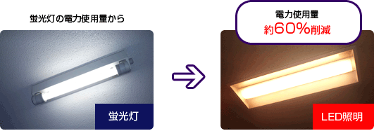 住宅の建設にあたっては、共用部及び専有部においてLED照明を採用しています。既存住宅についても、共用部において計画修繕時に従来の蛍光灯からLED照明への取替えを行っています。蛍光灯をLED照明に更新すると、同等以上の明るさを維持しつつ、電力使用量を約60%削減することができます。