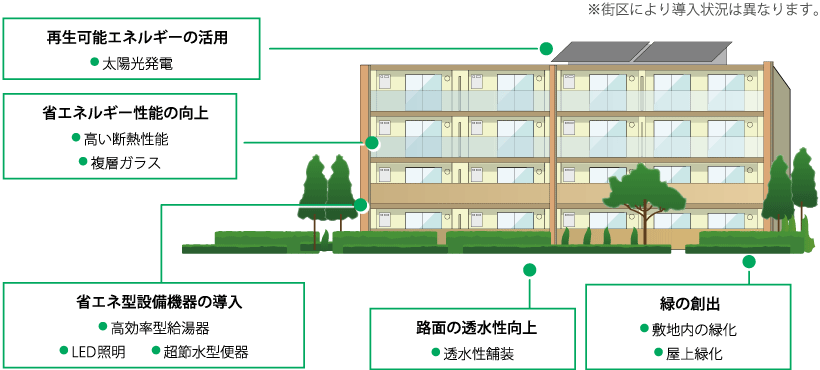 東京都のCO2削減目標(2030年までにエネルギー消費量30%減(2000年比))の実現のため、住宅の建替え時には再生可能エネルギーの活用を推進しています。また、既存樹木の保存に努めるとともに、住宅の立地・規模等の特性に応じた敷地内緑化等に取り組み、ヒートアイランド現象の緩和や緑豊かな景観の形成に貢献しています。