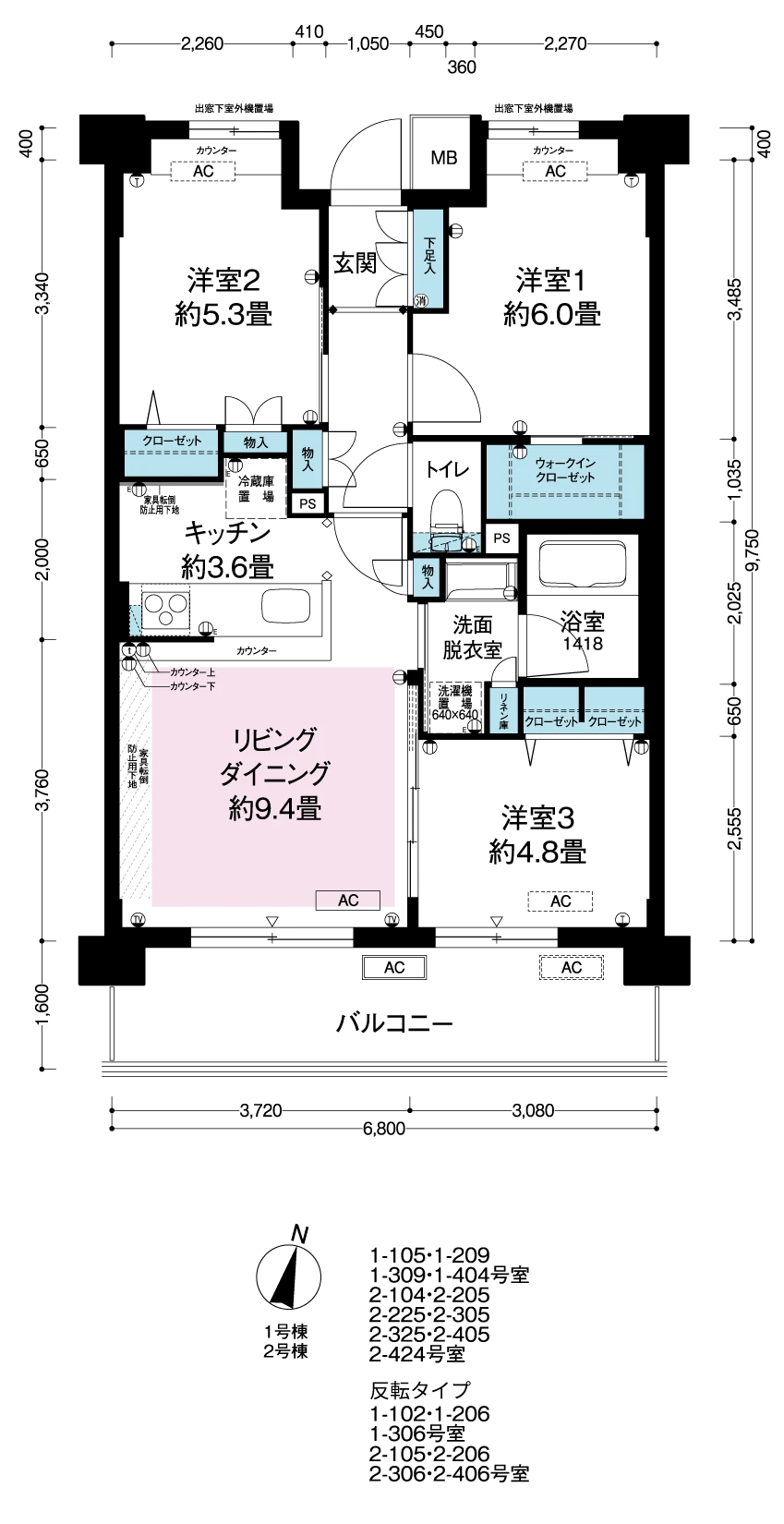 ※2-225・2-325・2-424号室のみ、洋室3のエアコン室内機取付想定位置及びバルコニーのエアコン室外機取付想定位置が異なります。