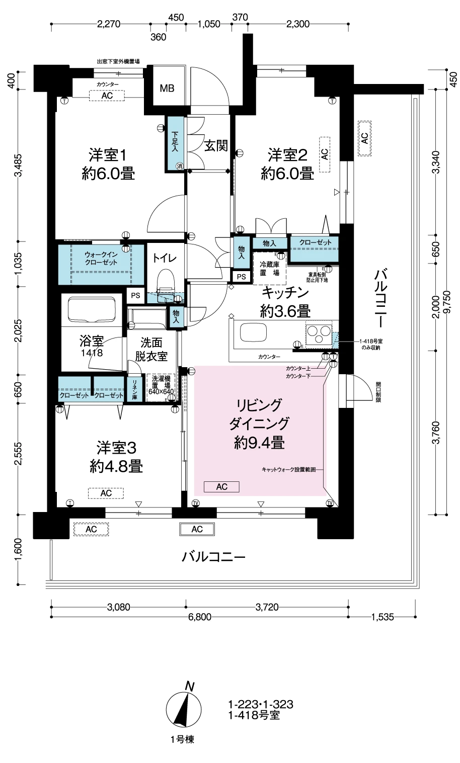 ※ペットゲート用下地(1号棟のみ)は床面から高さ約1,800㎜の範囲に設置されています。