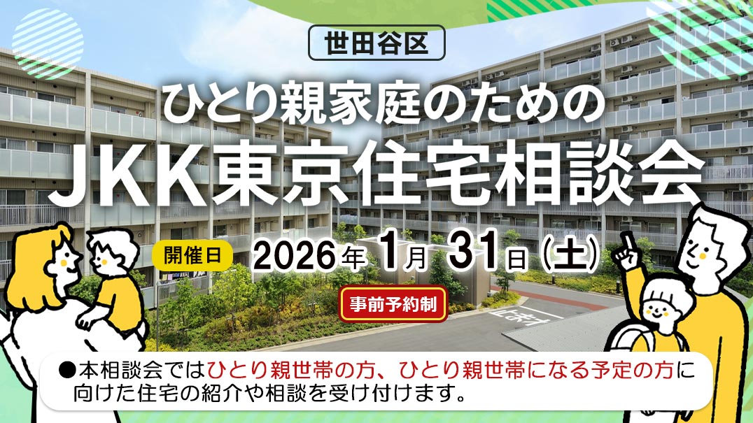 JKK東京は、世田谷区共催のもと、令和8年1月31日(土曜日)、北沢タウンホール(世田谷区・下北沢)にて、ひとり親世帯の方(20歳未満の子どもがいる方)を対象に、住宅相談会を開催いたします。