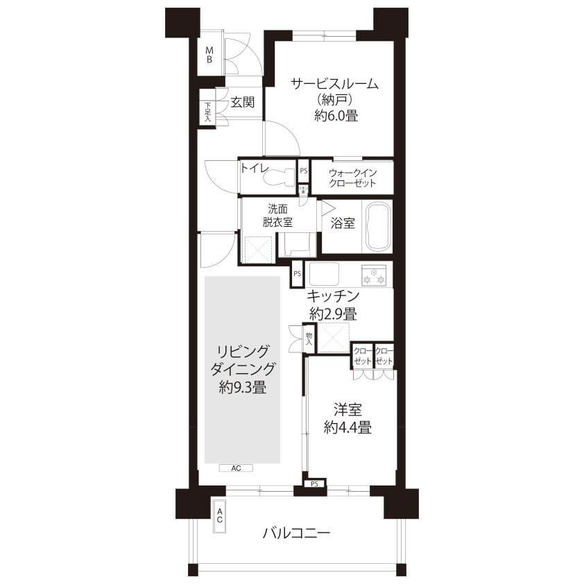 間取り(向き)1LDK(南)44.65m²