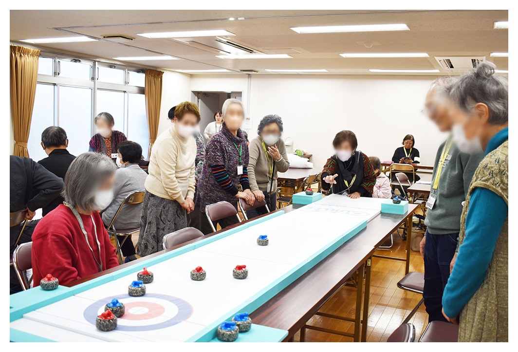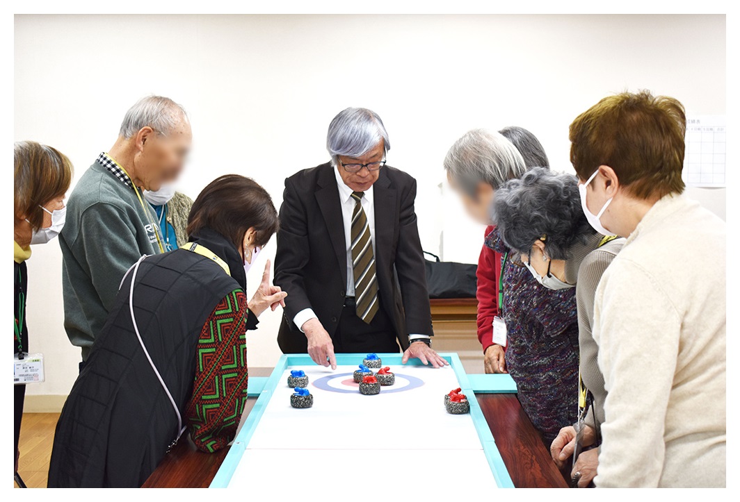 参加者は4つのチームに分かれて総当たりのリーグ戦を行い、合間には休憩を取りながら、参加者同士がお茶を囲んで楽しく会話を交わしました。カーレットのコツやスマホの便利な使い方、地域の話題などで盛り上がり、和やかな交流の雰囲気の中でも、一投ごとに歓声や拍手が起こるにぎやかな展開となりました。