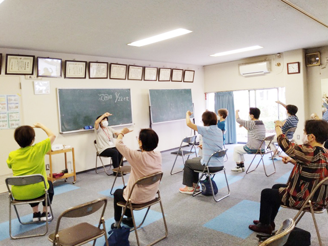 椅子を使った体幹を鍛える運動や、目線を指先の上下左右に動かしたり、左右の指で違う動きをしながら数を数えたりなど、頭を使ったトレーニングをされていました。途中で水分補給と休憩を挟みながら、みなさんご自身のペースで取り組まれており、やり遂げたあとの達成感からか、多くの方が晴れ晴れとした表情をされていたのが印象的でした。