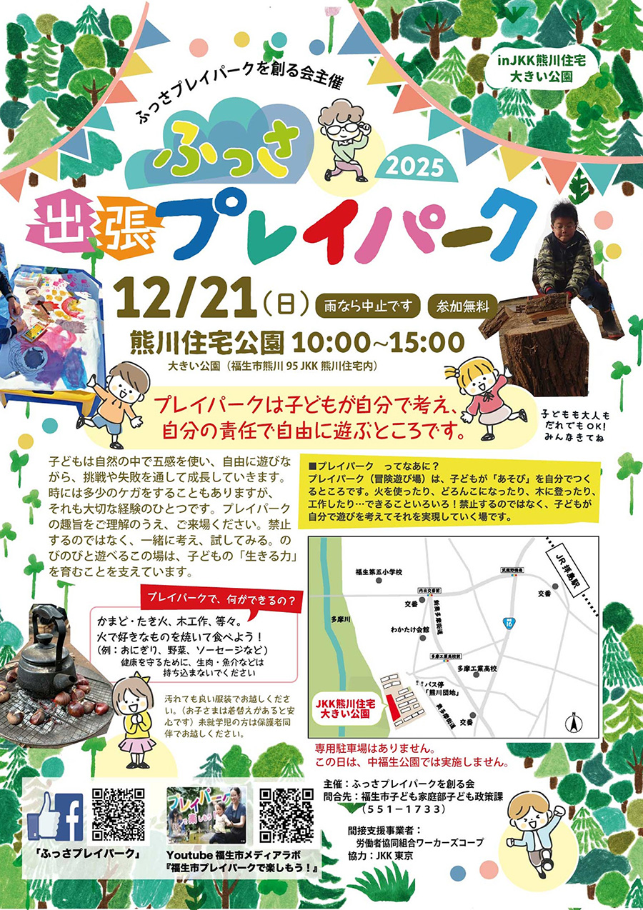 JKK東京は、福生市のJKK住宅※「熊川住宅」内の公園で、子どもたちが自由に遊びを創造できる屋外遊び場「プレイパーク」を令和7年12月21日(日曜日)に初開催します。