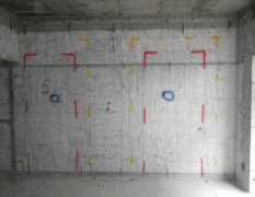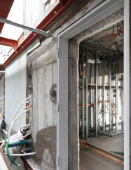 設備配管を「設備壁」という間仕切り壁の中に収めました。配管類は北側新設廊下に面する壁から外部の設備スペースに集約しています。